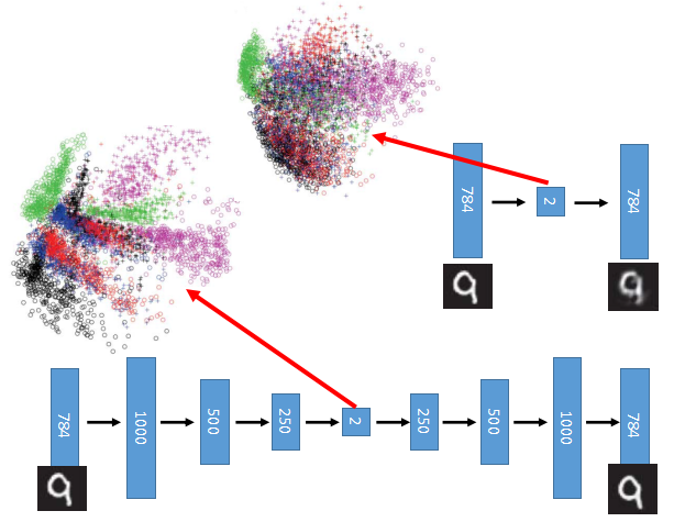 上面是使用PCA和autoencoder对于数字图片压缩后的可视化结果,明显autoencoder的区分度更高。