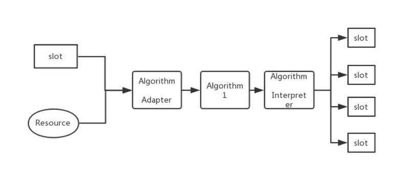 即每一个算法,都依赖于若干个槽位(Slot)和资源(Resource),一旦槽位和资源就位,就会触发对应的算法执行。算法的执行先通过算法适配器,来适配槽位和资源中的数据,转换成算子的输入格式。然后算子执行算法本身,执行完算子后,再经过算法解析器。算法解析器主要用于解析算法执行的结果,触发对应的槽位。如根据算法的结果,触发 Top 3 的结果。