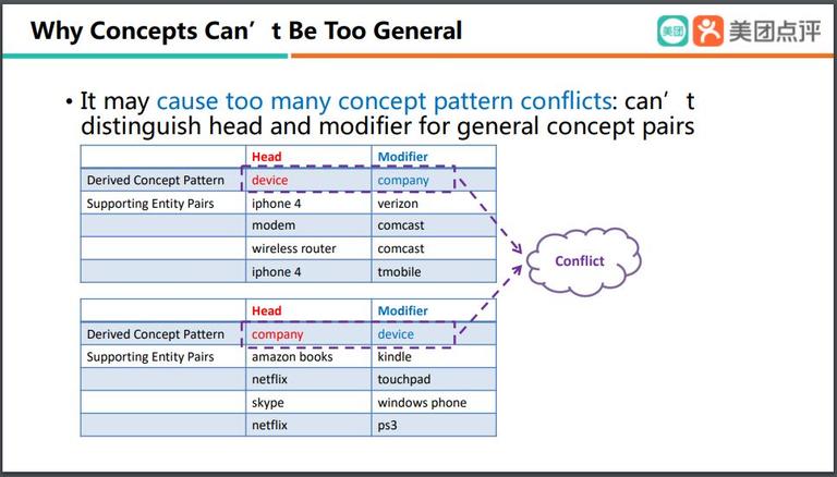 但是它也不能太 Specific,因为如果太 Specific,可能就会缺少表达能力。最坏的情况,它有可能就会退化到 Entity Level,而 Entity 至少都是百万的规模,那么整个 Concept Patterns 就有可能变成百万乘以百万的级别,显然是不可用的。