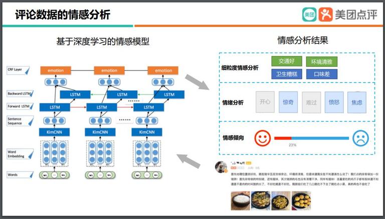 下面再简单介绍一下,我们如何进行评论数据的情感挖掘。我们用的是 CNN+LSTM 的模型,对于每一个用户的评价我们都能够分析出他的一些情感的倾向。同时我们也正在做细粒度的情感分析,我们希望能够通过用户短短的评价,分析出他在不同的维度,比如说交通、环境、卫生、菜品、口味等方面的不同的情感分析的结果。值得一提的是,这种细粒度的情感分析结果,目前在全世界范围内都没有很好的解决办法,但是美团大脑已经迈出了非常重要的一步。