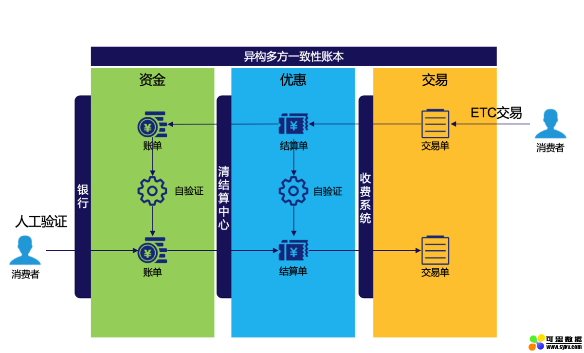 ETC收费系统负责消费记账,清结算中心负责清分、结算,银行账务系统负责实际扣款,这三方都存在自己的异构化账本。消费者要判断一次消费是否准确,其实是个比较麻烦且高成本的事情。首先,消费者需要登录本省ETC清结算中心公众号或APP查询ETC消费记录,再登陆绑定银行的个人银行系统查询银行资金交易记录,从而比对资金是否一致,再凭借记忆核对这些交易记录是否的确存在。