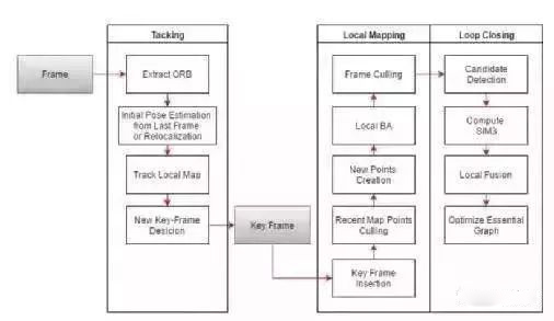 视觉VSLAM是一个集合了视觉里程计,建图,和重定位的算法系统。近年来发展很快。基于特征的视觉SLAM算法从经典的PTAM算法开端,目前以ORB-SLAM为代表的算法已经可以在PC上达到实时运行。下面是一个ORBSLAM的框图: