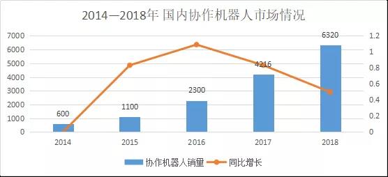 2018年中国协作机器人销量6320台,同比增长49.9%;市场规模达9.3亿元,同比增47.62%;2014-2018年,协作机器人销量及市场规模年均复合增长率分别为80.15%和64.83%。