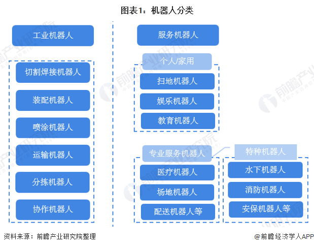 我国机器人主要分为工业机器人和服务机器人两大类,其中工业机器人主要包括切割焊接机器人、装配机器人、喷涂机器人、运输机器人、分拣机器人及协作机器人等;服务机器人包括个人/家用、专业服务机器人及特种机器人等三类。