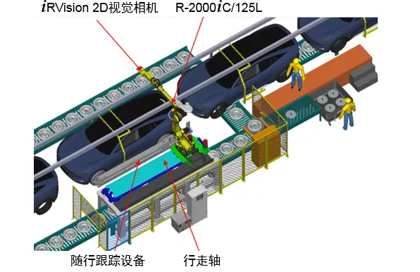 本系统主要由机器人、行走轴、随行跟踪系统、iRVision视觉系统以及柔性化TOOLING等构成。