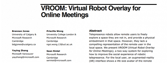 VROOM已被美国计算机学会(ACM)的计算机系统人类因素会议(ACM CHI Conference on Human Factors in Computing System)接受发表。该会议原定于上周在夏威夷举行,但由于新冠肺炎等原因被取消了。VROOM是其之前一项研究贡献的续篇,2018年,ACM CHI上就出现了Mini-Me,正是一种将化身带入会议中以进行混合现实会议和互动的方式。