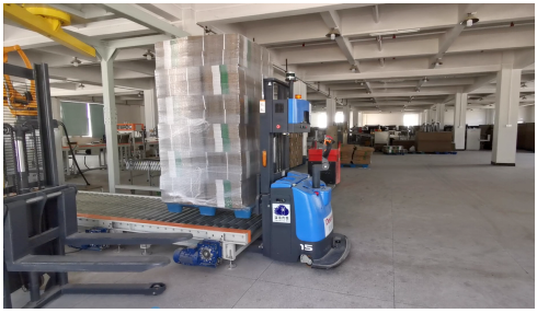 现场的生产制造产线为自动化产线,客户已实现了分纸-印刷-模切-打包-堆垛-缠绕等自动化生产工艺流程,但成品的出入库依然需要靠人工搬运。客户要求叉车运行需精准匹配生产节拍,正确对接产线的缠绕工序,完成整个产线的最后一道成品自动化入库转运流程。