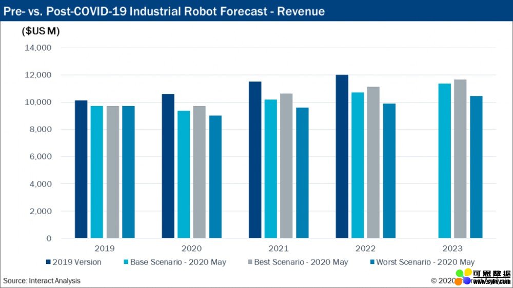据Interact Analysis预测,因疫情影响,到2020年,全球工业机器人市场的收入将下降3.6%,出货量将下降3.7%。终用户被动延迟自动化计划和项目的实施,预计2021年将出现强劲反弹。