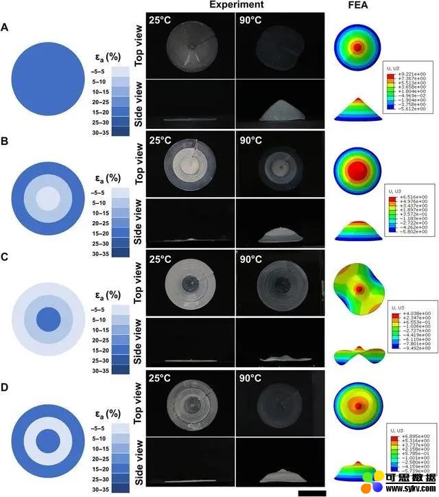 △图解:(A)到(D)是四个圆周印刷有LCE细丝的圆盘。LCE细丝的致动应变在(A)中是均匀的,并且在(B)到(D)中具有定制的梯度。每个圆盘的驱动应变大小由草图中蓝色的暗度表示。当圆盘浸入90℃的热水中时,四个圆盘的热致变形彼此有显著不同。进行有限元模拟以模拟变形的形状。垂直位移场用不同的颜色表示。比例尺,20毫米。图片来源:加州大学圣地亚哥分校
