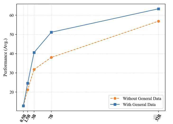 可以看到引入通用领域数据能够显著提升模型在OOD任务上的泛化能力,且这一优势随模型规模增大而愈发明显。这表明,在进行特定领域后训练时,适当混合通用知识不仅不会影响专业任务上的表现,反而有助于提升模型的泛化能力。