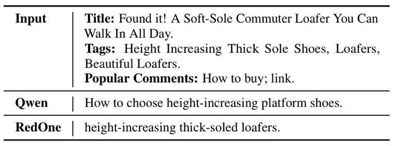 输入的上下文是一条关于“增高乐福鞋”的种草笔记,具有明显的购买意向。Qwen生成了一条宽泛的购物查询,关键词笼统,难以直接定位目标商品。而RedOne则精准锁定了 “增高乐福鞋” 等核心产品词,清晰地反映了用户的需求。