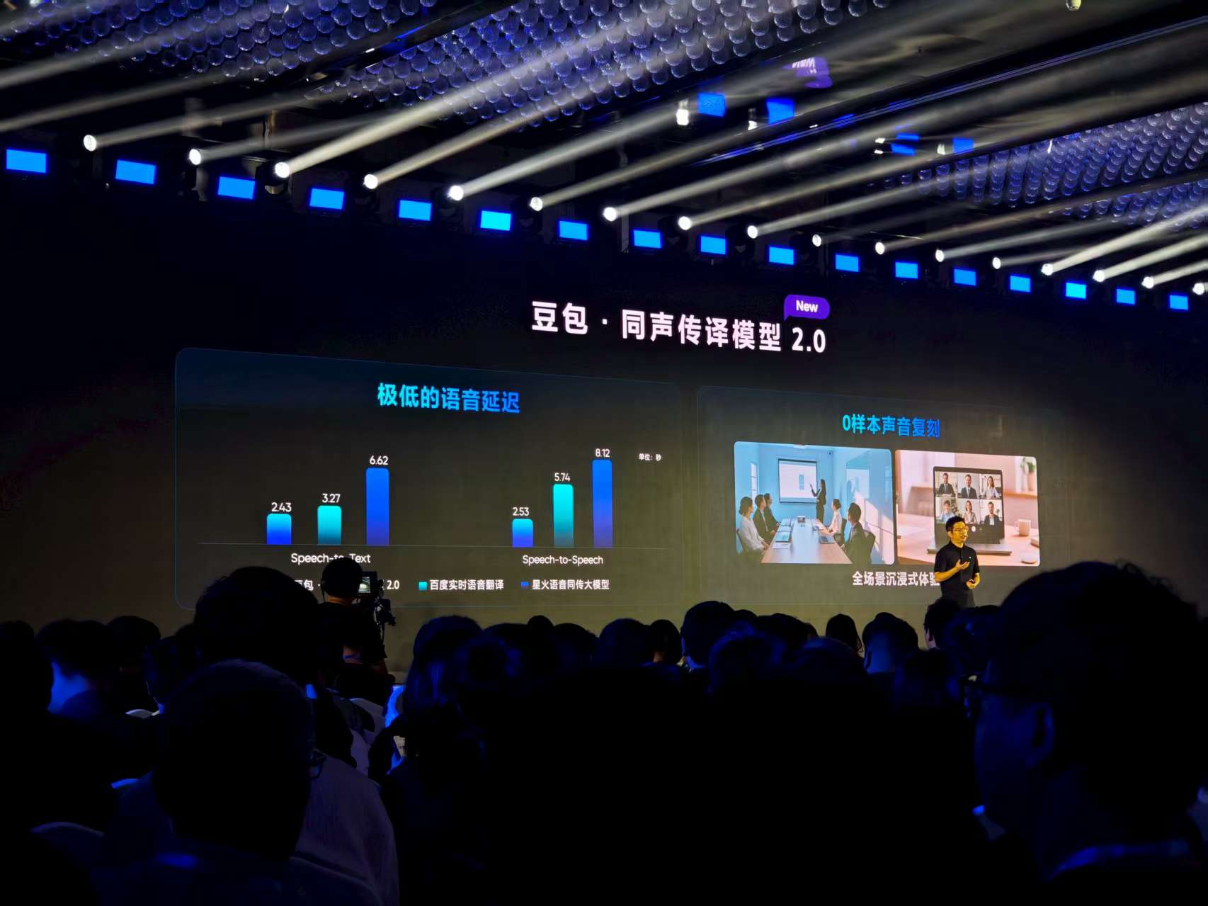 谭待在现场演示了一下,在没有事先进行声库训练的情况下,豆包基本能做到在使用者说完后立刻复刻、翻译并完成同传,效果非常惊艳。