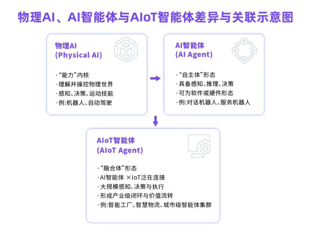 物理AI代表了AI的“能力内核”,AI智能体是AI能力的软件化表达,AIoT智能体则是二者协同、融合物联网后,在产业大规模场景下实现闭环与经济价值释放的“超级智能体”。