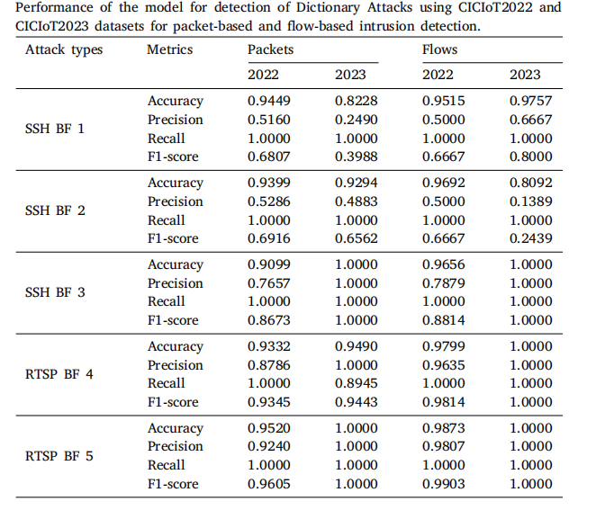 字典暴力攻击检测:对于 SSH 和 RTSP 暴力攻击,流级检测的召回率均为 100%。其中,RTSP 攻击的精确率达到 100%,而在 SSH 攻击检测中,因涉及部分非 IoT 设备(如笔记本电脑等)的连接尝试,导致前两类 SSH 攻击检测存在一定误报情况 。以 RTSP 暴力攻击为例,流级检测精确率、召回率均为 100%,F1 分数 1.0;数据包级检测精确率 0.98,召回率 96%,F1 分数 0.97,如下图所示。