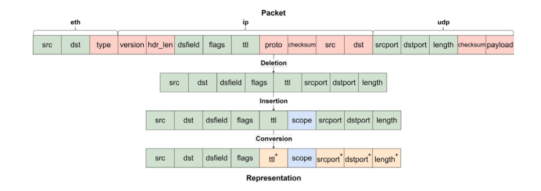 特征筛选与转换:从数据包的通信、服务和头部值三个层面提取关键特征。例如,保留源 / 目的 MAC 地址以标识通信端点,将端口号按 10,000 范围归类(如 [0–10,000]),将 payload 长度映射为最接近的 2 的幂值,同时删除随机头部(如校验和、序列号)和不变头部(如 IP 版本号)。