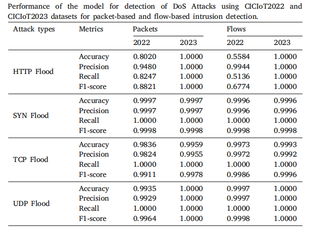 DoS 攻击检测:在 SYN Flood、TCP Flood 等 DoS 攻击类型检测中,流级检测的准确率、精确率、召回率近乎 100%。对于 HTTP Flood 攻击,由于其流量特征较为复杂,当基于 CICIoT2022 基线进行检测时,召回率为 82.47%,但在流级检测策略下,性能得到显著优化 。例如 SYN Flood 攻击,流级检测精确率、召回率、准确率均为 100%;HTTP Flood 攻击基于 CICIoT2023 基线流级检测,精确率 0.99,召回率 95%,F1 分数 0.97如下图所示。