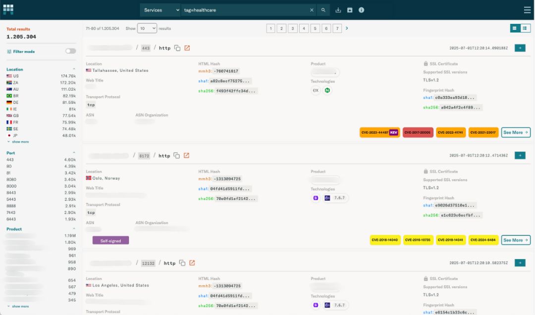 研究人员通过在Magnify工具中使用“device DNA”标签“HEALTHCARE”进行查询,成功识别出超过120万个可被公开访问的设备。尽管其中部分可能是蜜罐(用于诱骗攻击者的伪装系统),但结果依然令人震惊。许多设备由于安全漏洞、配置失误,甚至缺乏有效的身份验证机制,处于高风险状态。查询结果包含设备类型、IP地址及其地理位置信息等详细内容。