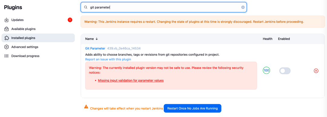 1.排查Jenkins是否安装了Git Parameter插件,在不影响业务的前提下,可临时禁用。排查位置:Jenkins-系统管理-插件管理,检索是否安装了该插件;