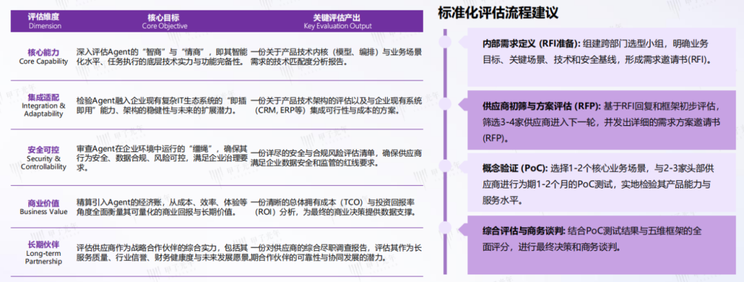 为了在纷繁的选项中做出明智决策,科学的评估体系不可或缺。 报告提出的五维供应商评估框架(核心能力、集成适配、安全可控、商业价值、长期伙伴)为企业提供了科学的决策依据。