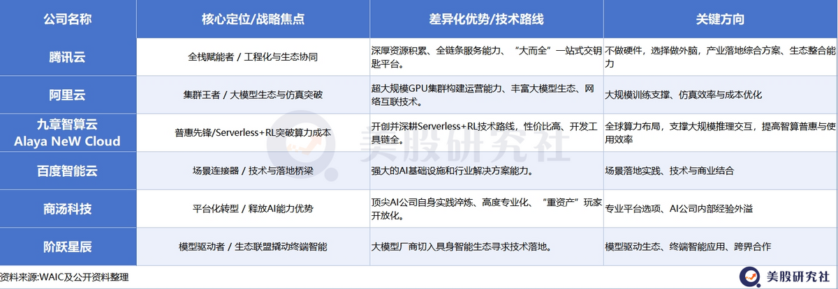 根据 WAIC 的展示,一个初步的竞争格局正在显现。阿里云、腾讯云、百度智能云、九章云极凭借其综合实力处于前列;商汤科技、无问芯穹等则代表创新力量,从场景落地、平台开放、生态合作与底层技术创新等维度寻求差异化发展。