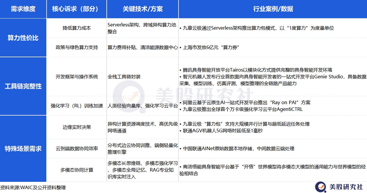 具身智能在实时决策延迟、云到端数据协同效率、多模态协同计算等业务场景下存在特定需求,对算力平台提出了明确要求。