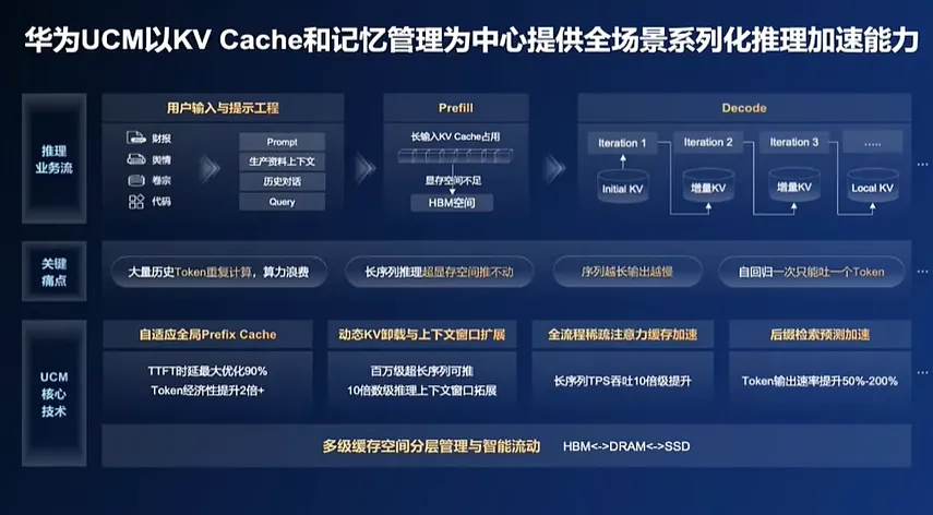 现实挑战下,华为重磅推出了 AI推理加速“黑科技”UCM(推理记忆数据管理器,Unified Cache Manager)。这一突破性技术通过创新架构设计和存储优化,突破了HBM容量限制,提升了国内AI大模型推理性能,完善了中国AI推理生态的关键环节。