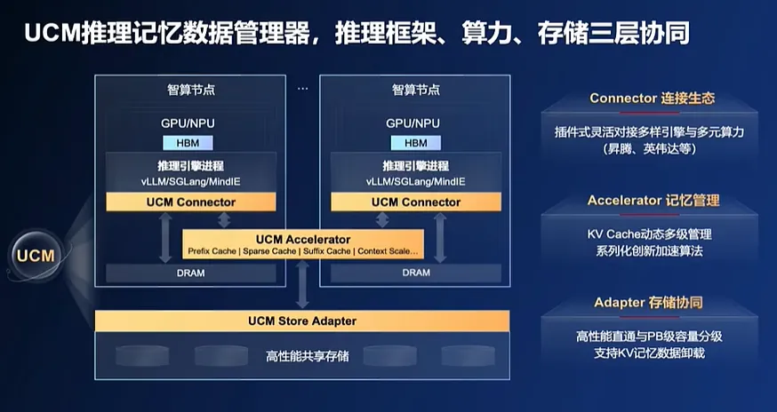 从架构上看,华为的 UCM解决方案主要有三大组件构成: 对接不同引擎与算力的推理引擎插件( Connector)、支持多级KV Cache管理及加速算法的功能库(Accelerator) 和 高性能 KV Cache存取适配器(Adapter) ,实现了 推理框架、算力、存储三层协同 。