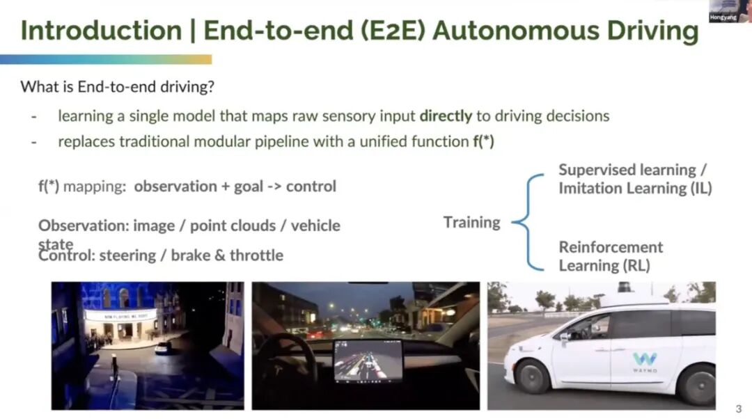 Li Hongyang 在演讲中首先明确了端到端自动驾驶的核心定义:“学习单一模型,直接将原始传感器输入(图像、点云、车辆状态等)映射到驾驶控制指令(转向、刹车、油门)”,其本质是用 “统一函数” 取代传统自动驾驶的 “感知 - 定位 - 预测 - 规划 - 控制” 模块化流水线。这种架构革新的关键价值在于两点: