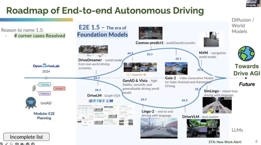 Li Hongyang 强调,1.5 代的本质是 “用基础模型的能力补全端到端的短板”——WM 试图解决 “数据稀缺”,VLA 试图解决 “决策不可解释”,但两者都未脱离 “数据驱动” 的核心,也都面临 “如何走向大规模工程落地” 的共同挑战。