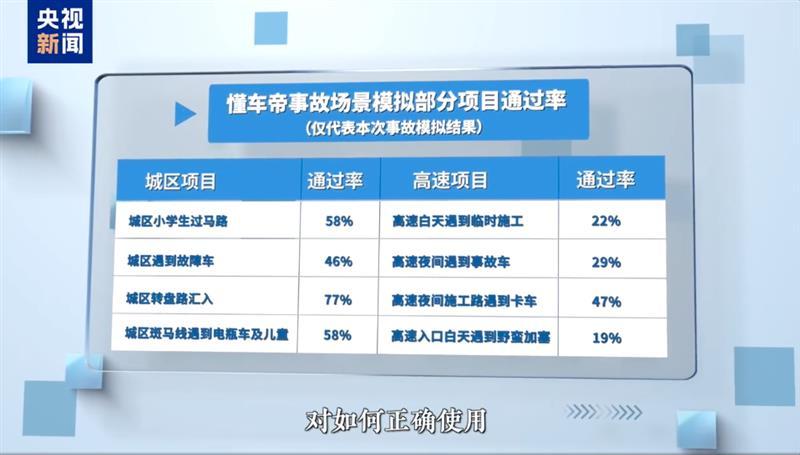 分测试项目来看,在高速项目中,受测车型白天遇到临时施工、夜间遇到事故车、施工路遇卡车、高速口遇野蛮加塞的通过率分别为22%、29%、47%、19%;而城区项目中,小学生过马路、遇到故障车、转盘路汇入、斑马线遇电瓶车及儿童,通过率分别为58%、46%、77%、58%。