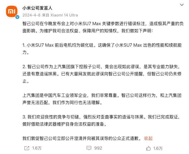 就在发布会结束之后,小米官方强硬驳斥了智己汽车,事件最终以智己汽车致歉结束,在之后的产品发布会很少有竞品的影子。