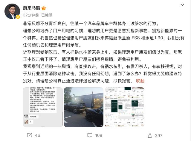 不仅如此,小红书、微博等社交平台还传出发布任务的抹黑蔚来的理想内部群截图。蔚来品牌与传播助理副总裁马麟直言,“有人把祸水往蔚来身上引……请理想真正通过法律途径解决问题,尽快报警”。