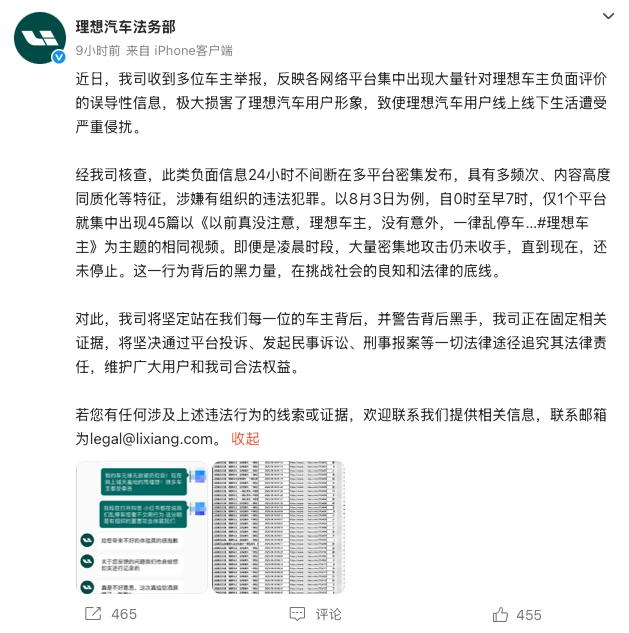 理想汽车法务部在社交平台发文表示,网络平台集中出现大量针对理想车主负面评价的误导性信息,极大损害了理想汽车用户形象,致使理想汽车用户线上线下生活遭受严重侵扰,并警告背后黑手,通过法律途径追究其法律责任。